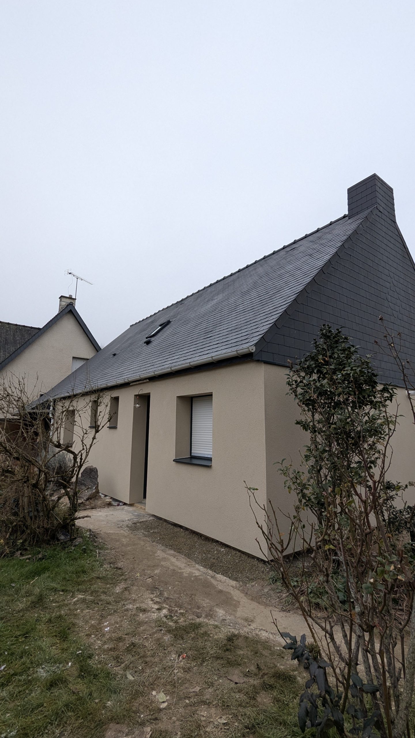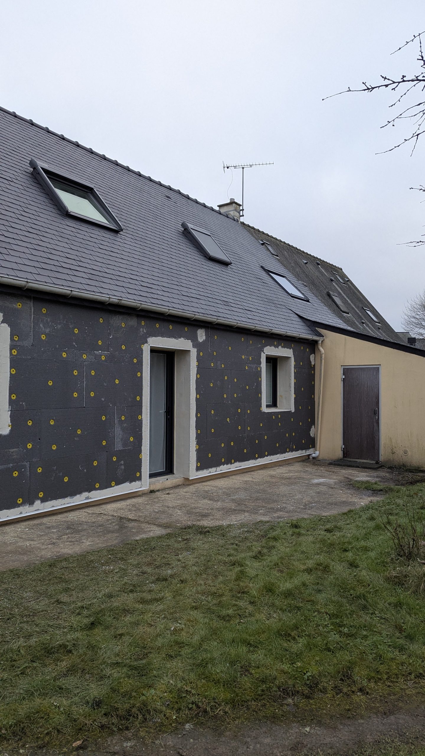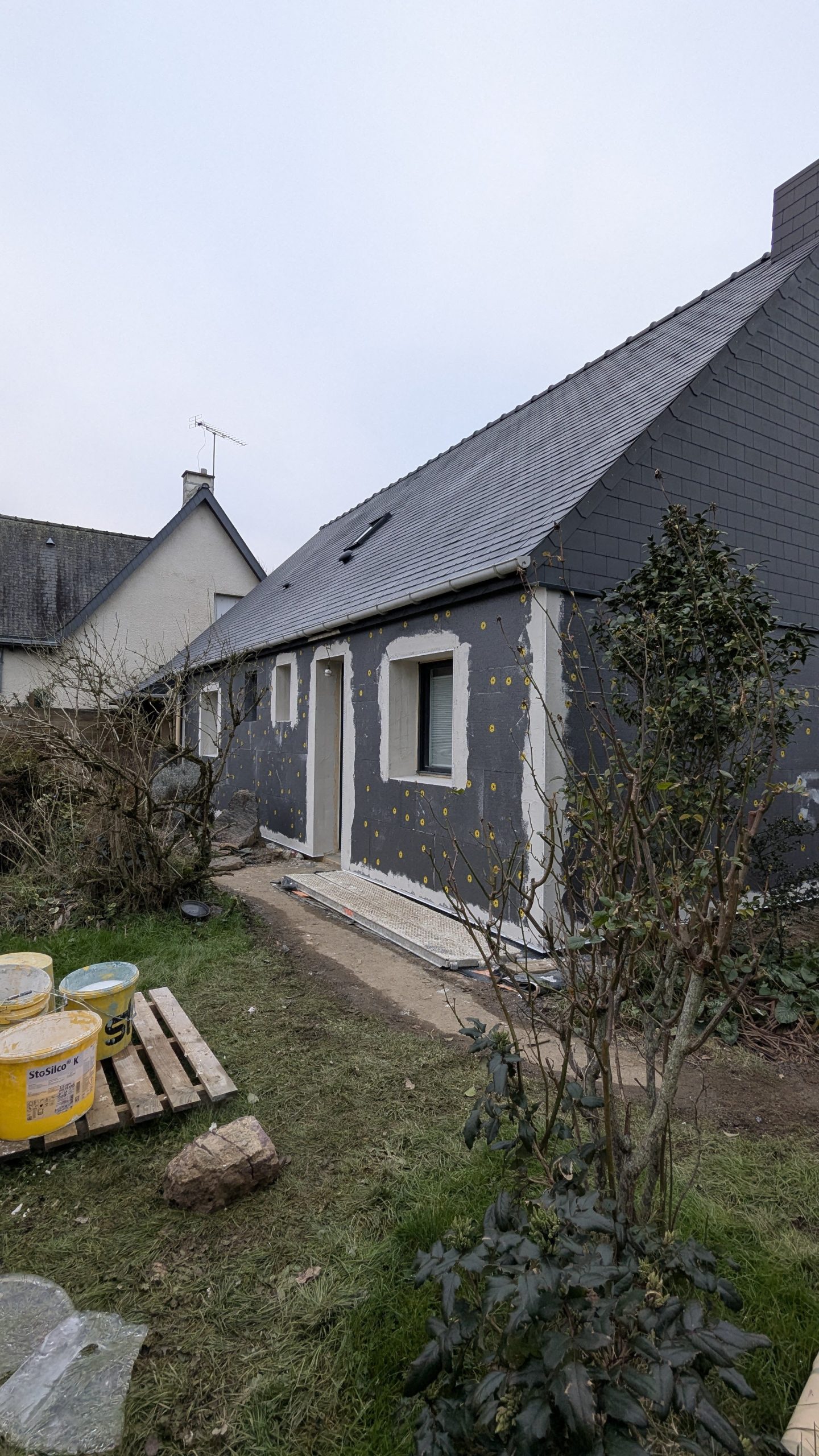 –> Ensuite, c’est au tour des murs : après remplacement des menuiseries extérieures et de la porte d’entrée, un isolant extérieur est mis en œuvre avant d’y projeter un enduit minéral gratté. Les volets battants en bois sont supprimés et les nouvelles menuiseries sont équipées de volets roulants.