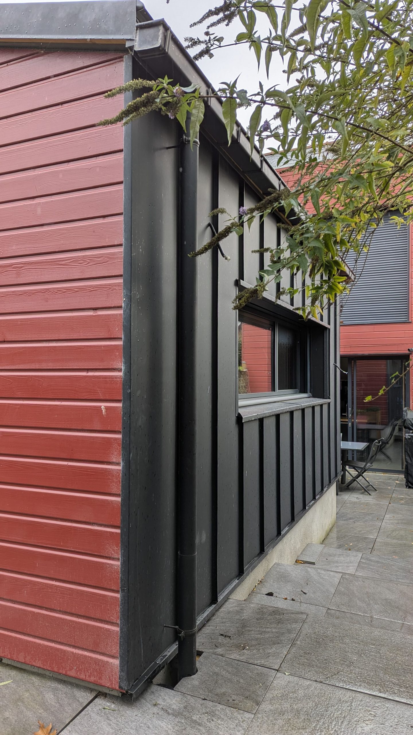 –> Côté matériaux, le choix est fait d’utiliser du zinc anthracite en bardage et toiture pour s’accorder à la teinte des menuiseries existantes. Le zinc alterne et sert de transition entre les façades de bardage en clins rouge neuve et existante. Il vient également séparer le profil asymétrique côté jardin pour marquer l’emprise du garage.