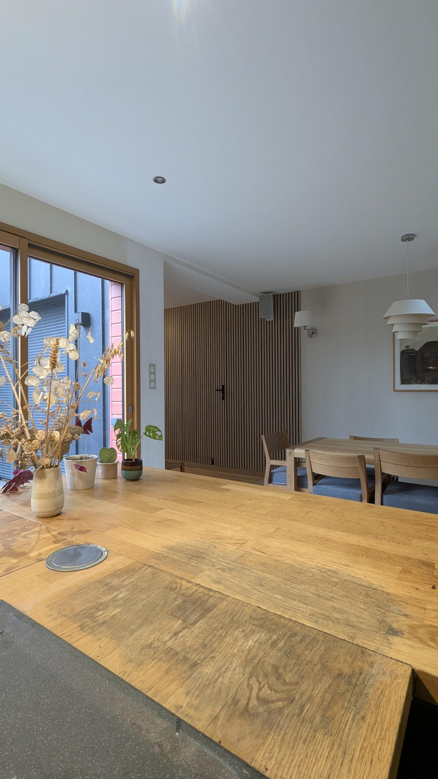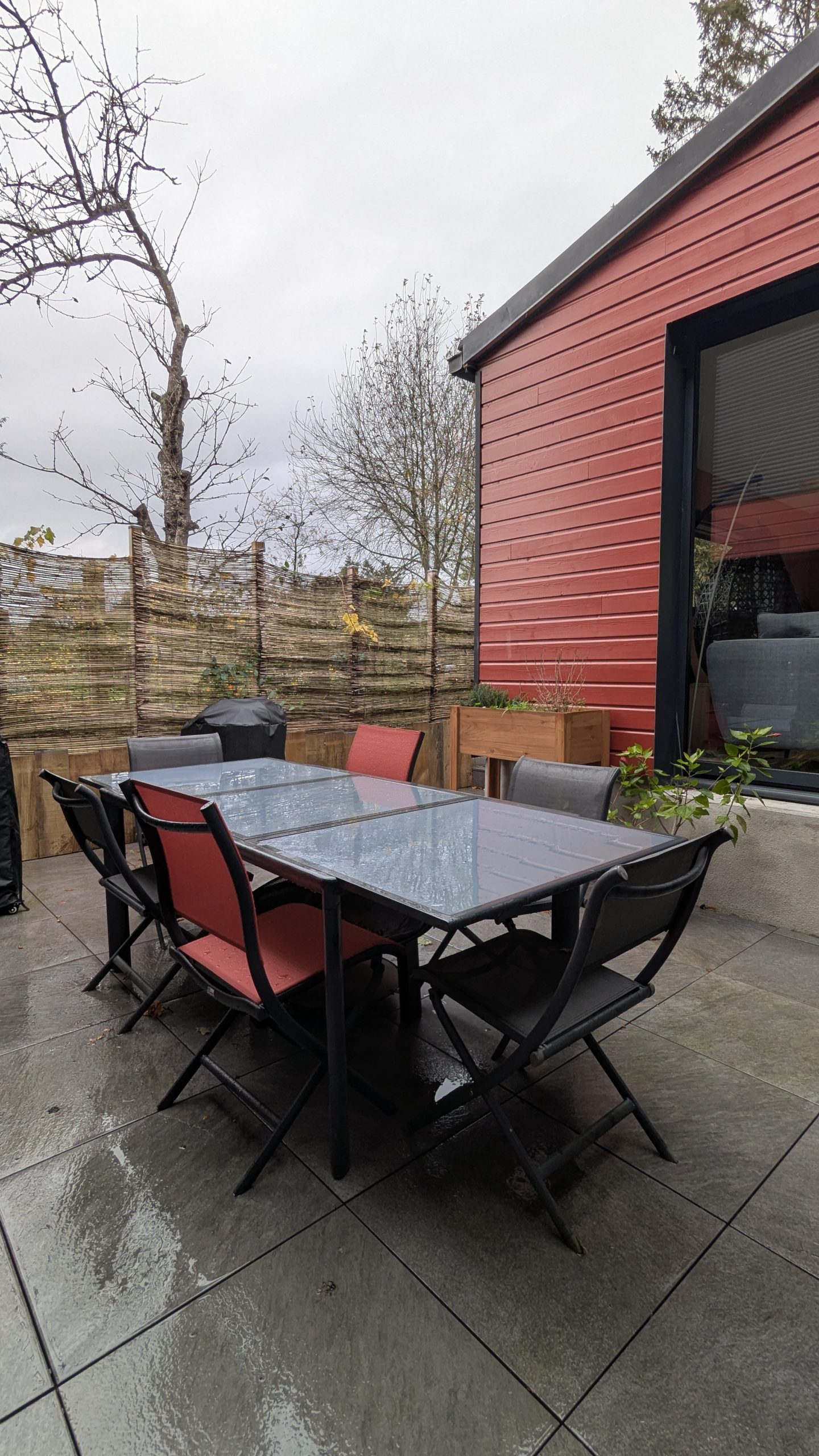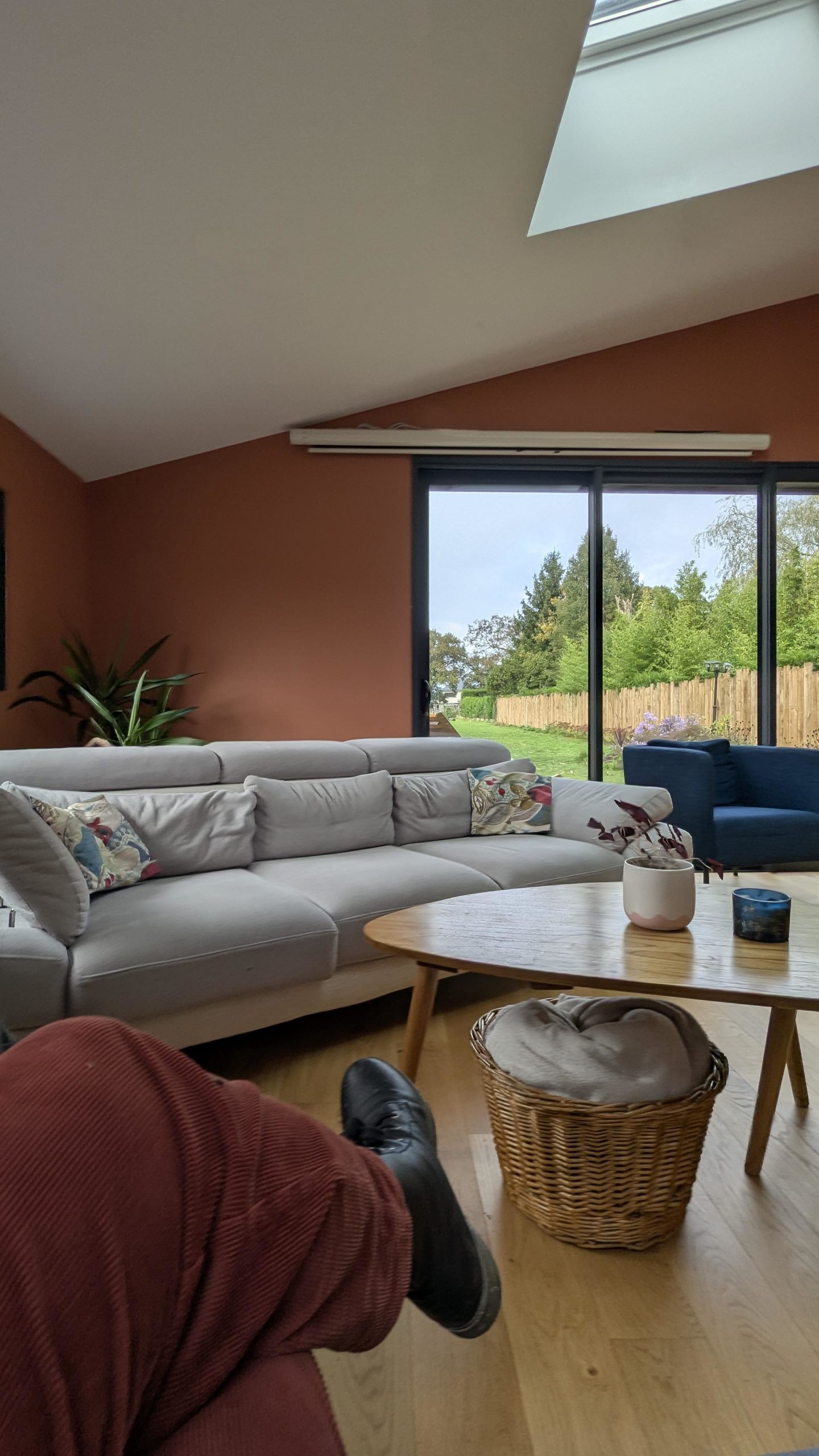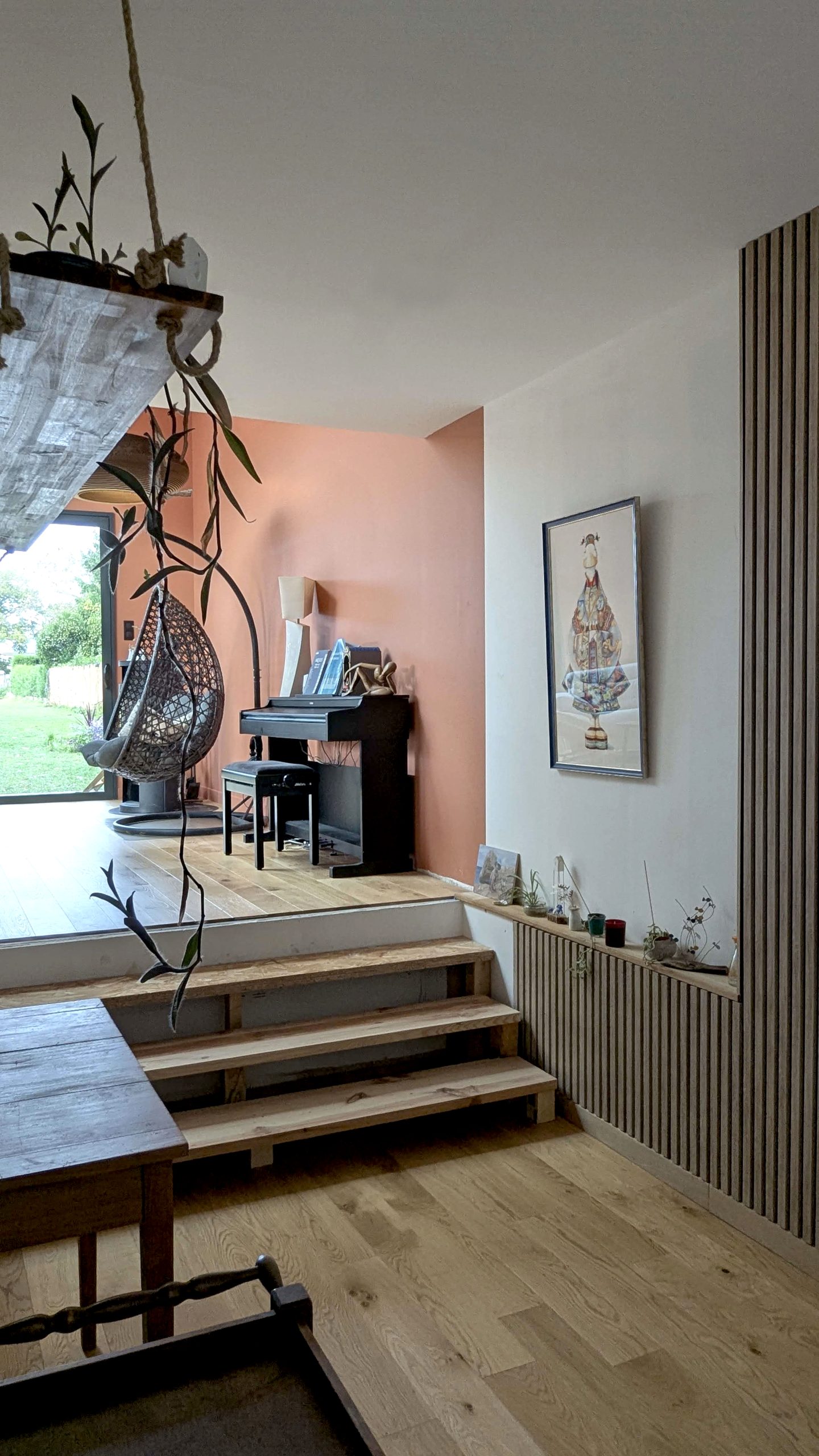 Dès la première visite, quelques points forts se distinguent. Ancienne maison en pierres côté rue, extension contemporaine à profil atypique et bardage sang de bœuf côté jardin, la maison est coupée en deux par un cœur dédiés aux espaces techniques (salle d’eau, arrière cuisine). Le salon côté Rue est traversé par la circulation d’entrée et plutôt sombre été comme hiver. Côté jardin, une cuisine ouverte et sa salle à manger sont largement ouvertes sur la terrasse et le jardin mais manquent de place, d’ailleurs, le sol le long de la baie vitrée est largement occupé par les semis de printemps destinés au potager.